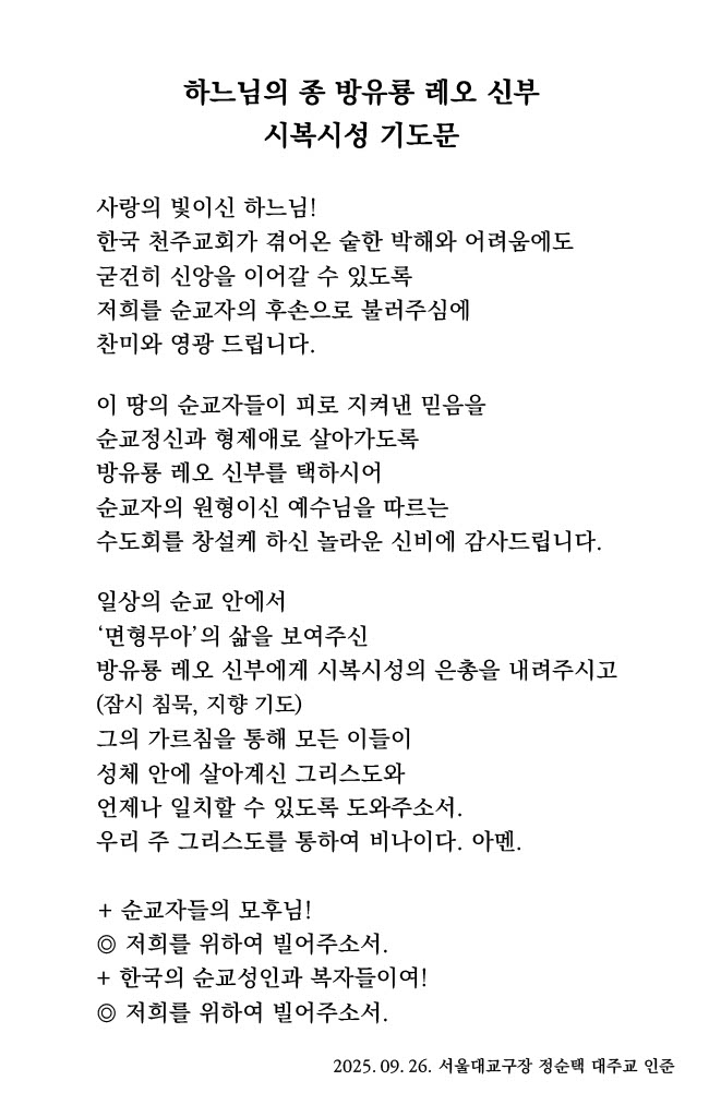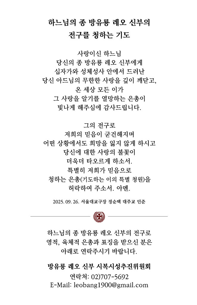 하느님의 종 방유룡 레오 신부 시복 시성 기도문 / 하느님의 종 방유룡 레오 신부의 전구를 청하는 기도